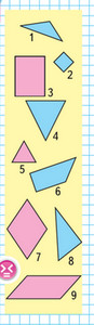 На чертеже на полях изображены треугольники – 1, 4, 5, 8. прямоугольники – 2, 3, 6, 7,9. Все фигуры можно разделить на 2 группы – по форме и по цвету. Группа 1 – по цвету: розовые и голубые. Группа 2 – по форме: прямоугольники и треугольники.