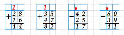 28 +16, 35 + 47, 42 – 25, 80 - 39