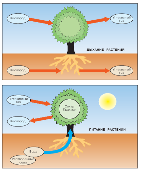 Процесс дыхания растений происходит в тёмное время суток. Листья растений поглощают кислород, а выделяют углекислый газ. При дыхание корни растений выделяют углекислый газ. Процесс питания происходит при солнечном свете, в результате в листьях растений образуется сахар и крахмал. Растение поглощает углекислый газ и выделяет кислород. Из почвы в корни растений поступает вода и растворенные соли, которые являются питательными элементами.