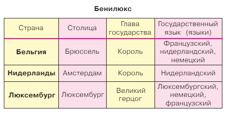 Расскажи по карте (с. 112) о странах Бенилюкса. Дополни эти сведения с помощью таблицы.
