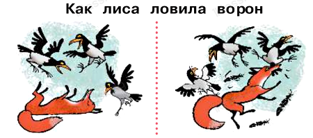 Подумай, в чём проявилась хитрость лисы. Составь рассказ по рисункам.