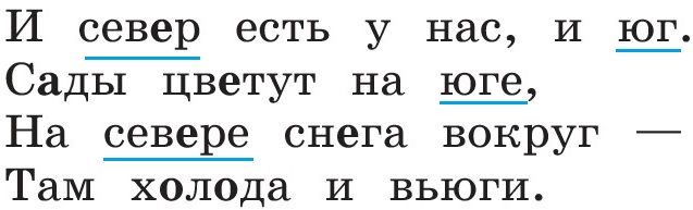 И север есть у нас, и юг.Сады цветут на юге,На севере снега вокруг —Там холода и вьюги.