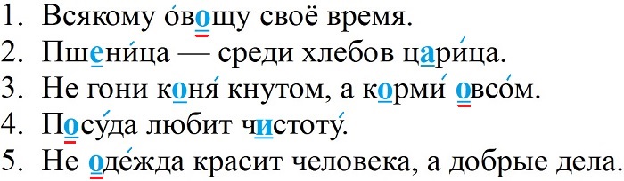 1. Всякому овощу своё время. — Кто-то торопит события или опаздывает с решением каких-либо дел.2. Пшеница — среди хлебов царица. — Хлеб делают из муки, а муку из пшеницы.3. Не гони коня кнутом, а корми овсом. — Чтобы коня хорошо служил, его нужно сытно кормить, а не кнутом погонять.4. Посуда любит чистоту. — В доме всё должно быть чистым.5. Не одежда красит человека, а добрые дела. — Человека нужно судить не по внешности, а по поступкам.